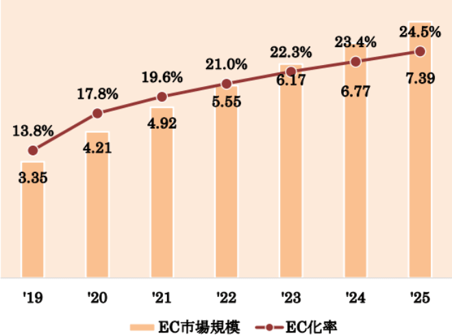 2025年には7.39兆USドル(日本円で約997兆円※)、EC化率は24.5%まで上昇すると見られています。