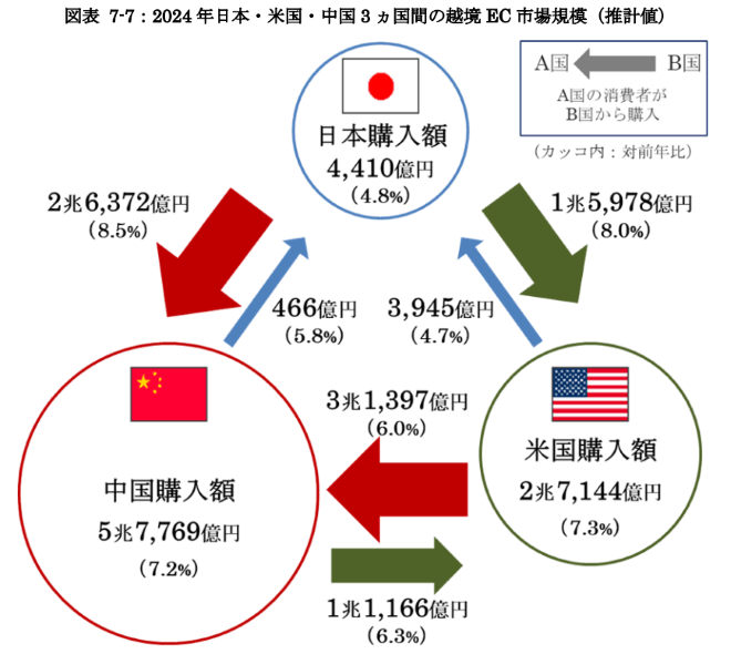 2024年には1兆100億USドルの市場規模だったことから、急激に世界規模で成長していくことが予想できます。なお、日本・米国・中国の3カ国間で越境EC市場規模を比較すると、下記のような差があります。