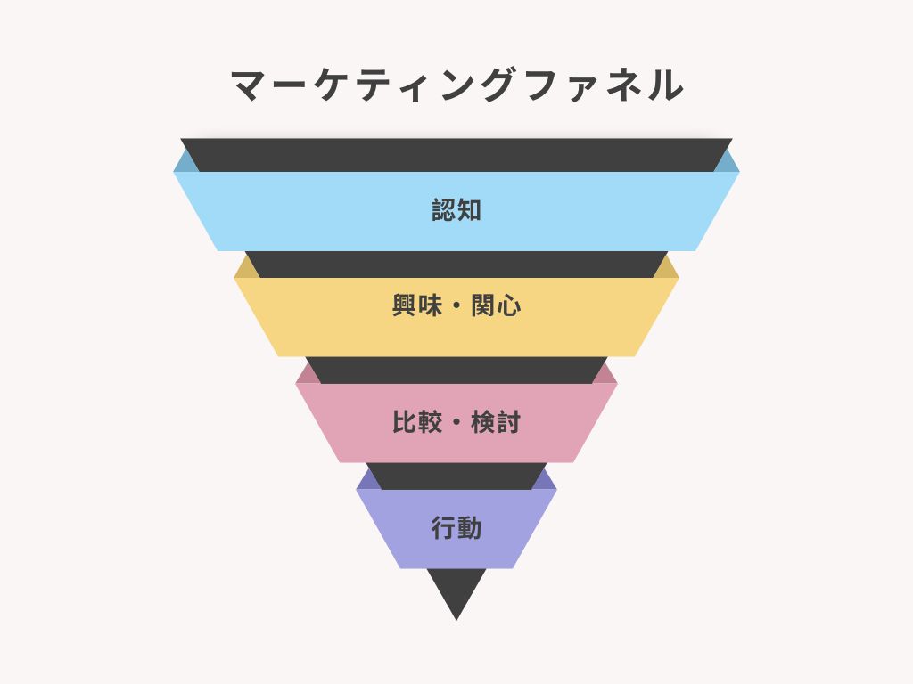 マーケティングファネルとは、消費者が行動に至るまでのプロセスを「認知、興味・関心、比較・検討、行動」に段階分けしたものです。